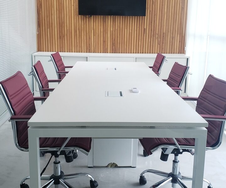 Case: Foram utilizados os mobiliários da Linha Q para equipar as salas da diretoria da empresa. As mesas foram fabricadas com tampo de madeira e vidro e a mesa de reunião com o pé requadro.