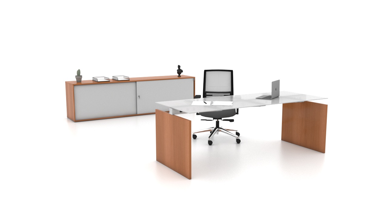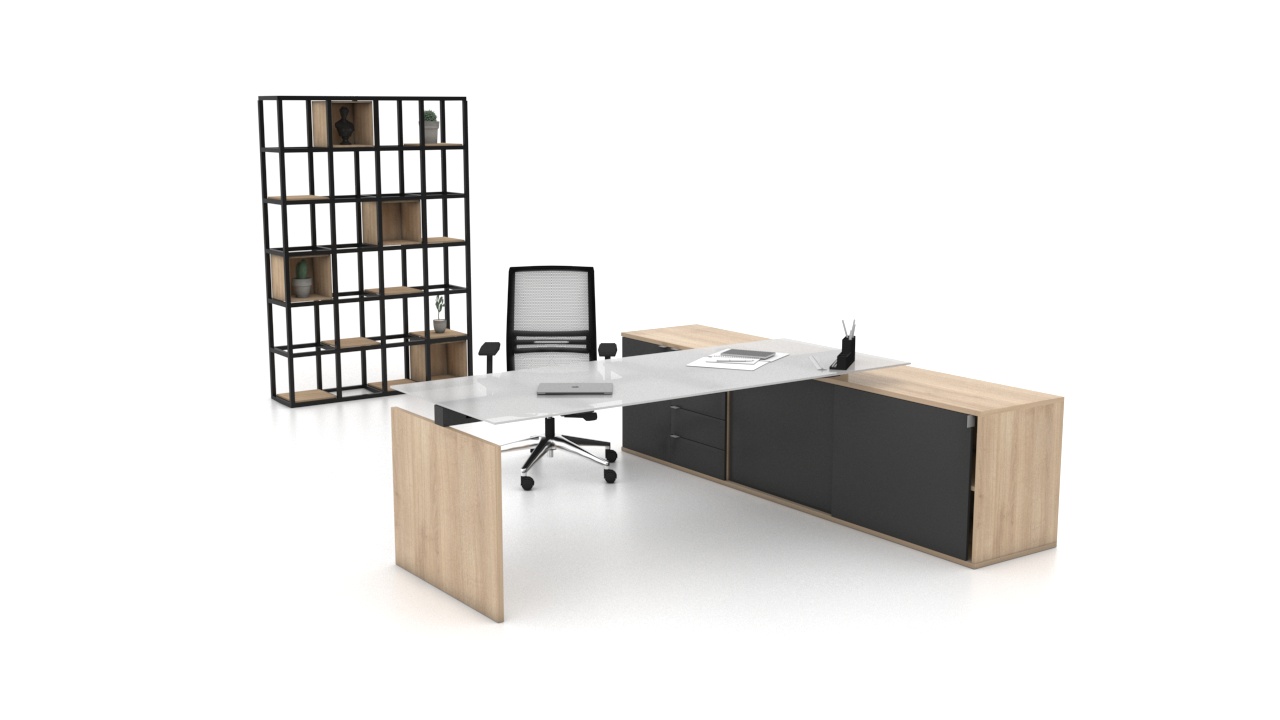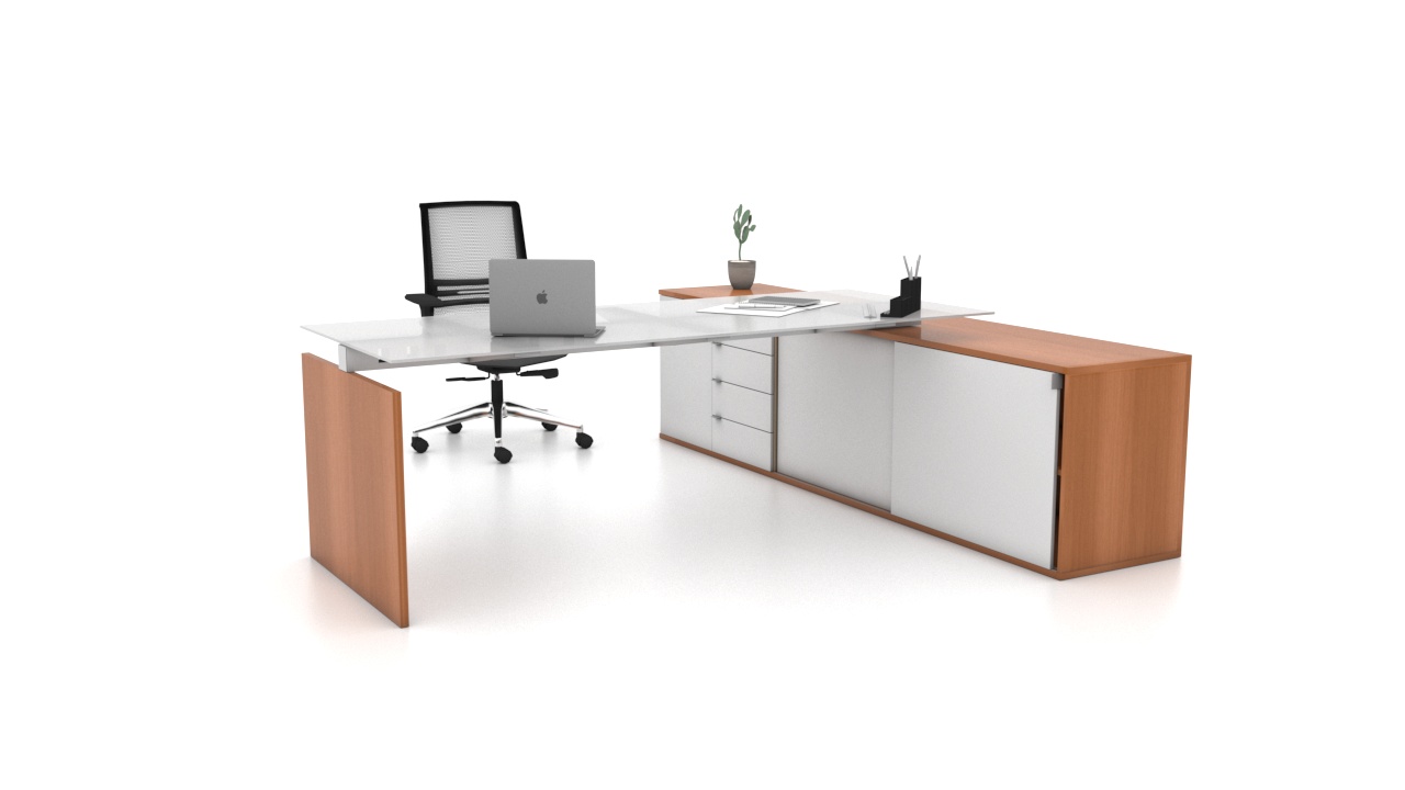 A linha Executiva N conta com um design clean e moderno, deixando o ambiente bonito e agradável. O tampo em vidro serigrafado permite várias opções de cores no acabamento e poderá ser suportado por uma credenza com gaveteiro.
